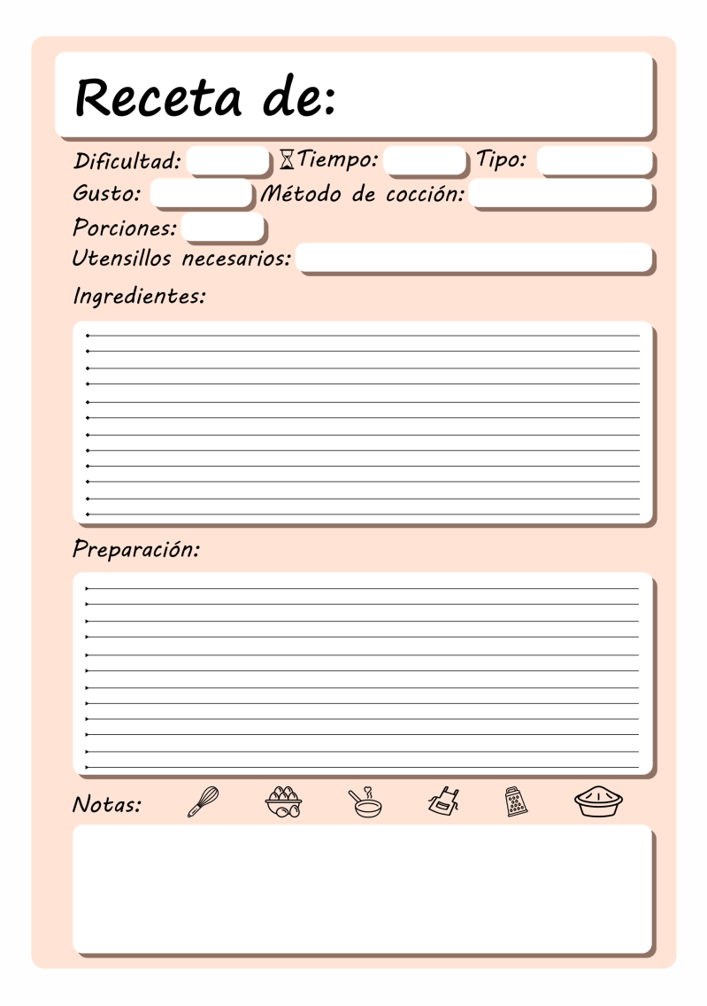 Diseño Intuitivo y Completo: Está «probada» y optimizada para incluir todos los campos necesarios: dificultad, tiempo, porciones, ingredientes, preparación y notas. ¡Nada se quedará fuera!
